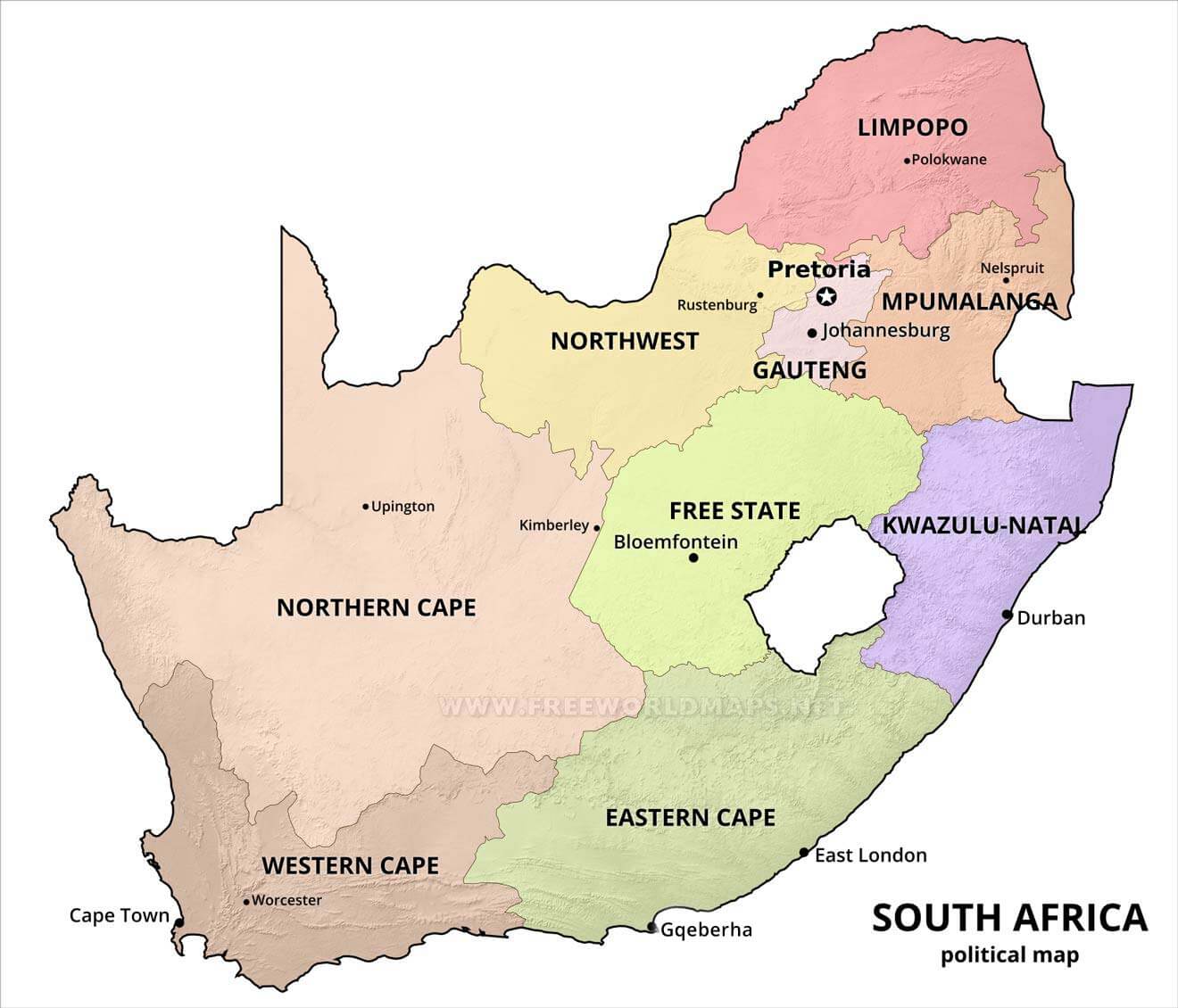 General map of South Africa, illustrating its provinces, major cities, basic topography