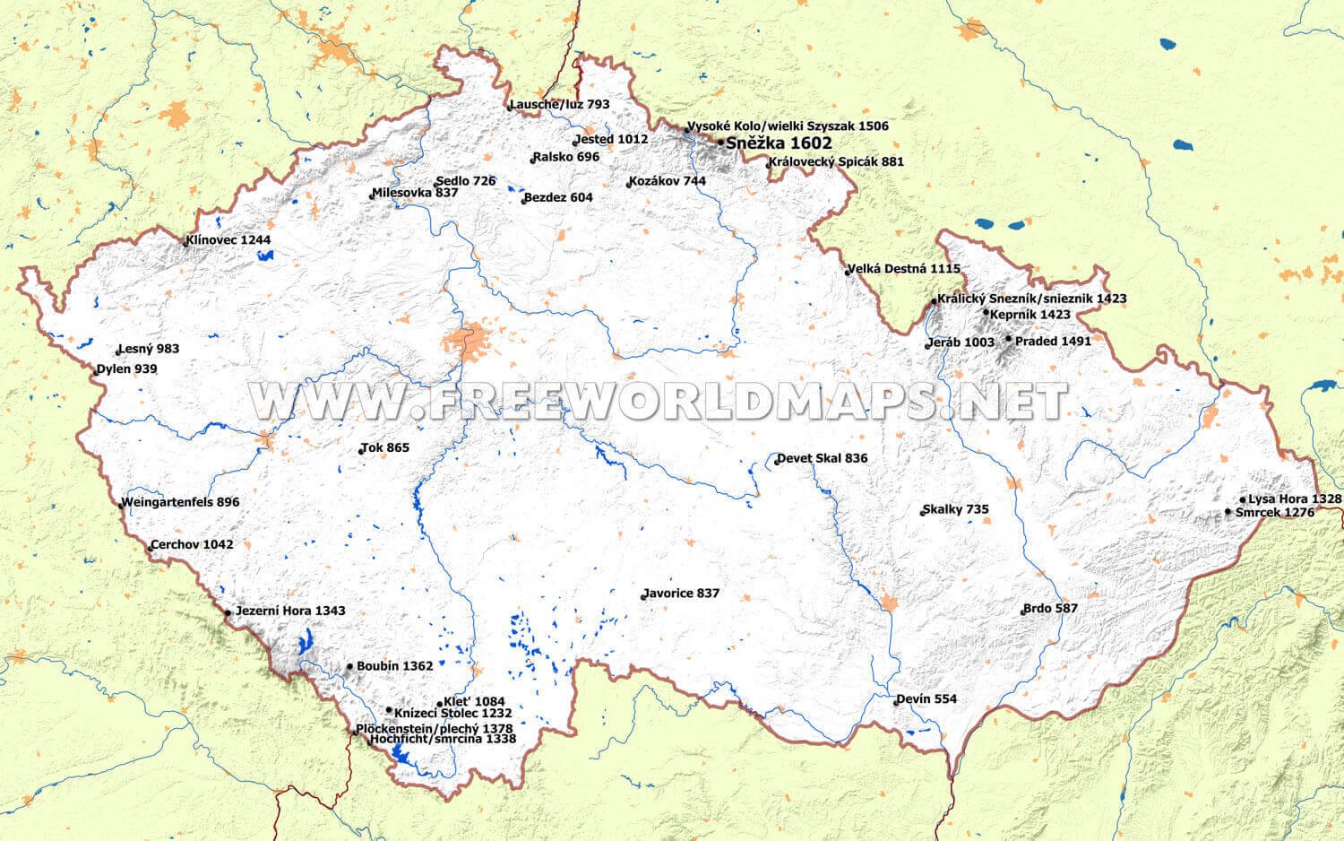 The landscape of Czechia is really diverse, especially when compared to its size. The country is surrounded by mountain ranges on almost all sides. The steep Ore mountains run on the northwestern parallel to the border with Saxony, its highest summit is the Klínovec reaching 1244 meters. Still on the German border, but at the southwestern edge of the country lies the heavily forested Bohemian Forest (highest peak Plechý 1378 meters). The Sudetes mark the northern, northeastern borderline towards Poland, this is the highest elevated range in the Czech republic, Sněžka is the highest peak at 1602 meters. The range of the Beskids close the full circle of mountain chains on the Czech-Slovakian border. It's altitude is very similar to the others, Lysa Hora is the highest altitude point at 1328 meters.