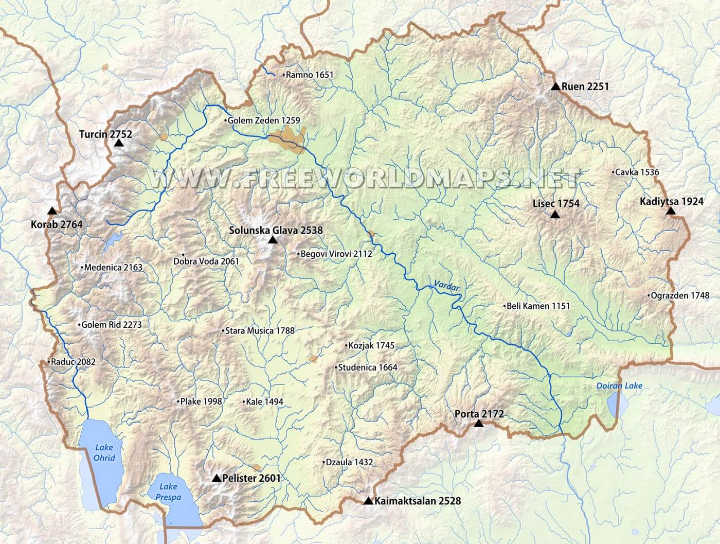 The landscapes of the Macedonia map are dominated by mountain ranges running in an approximately north-south directions at several longitudes of the country. The Šar Mountains on the western border with Kosovo and Albania are the highest of these ranges, Mount Korab is the highest, shared with Albania, getting as high as 2764 meters above the level of the Adriatic Sea. Further inside the country runs the arch of the West Vardar / Pelagonia mountain range, stuck between the Vardar and Crna rivers. Its highest is the Solunska Glava at 2538 meters. The Osogovo-Belasica ranges are on the northeastern Bulgarian border. These ranges are lower in altitude, hardly reaching the 2000 meters mark.