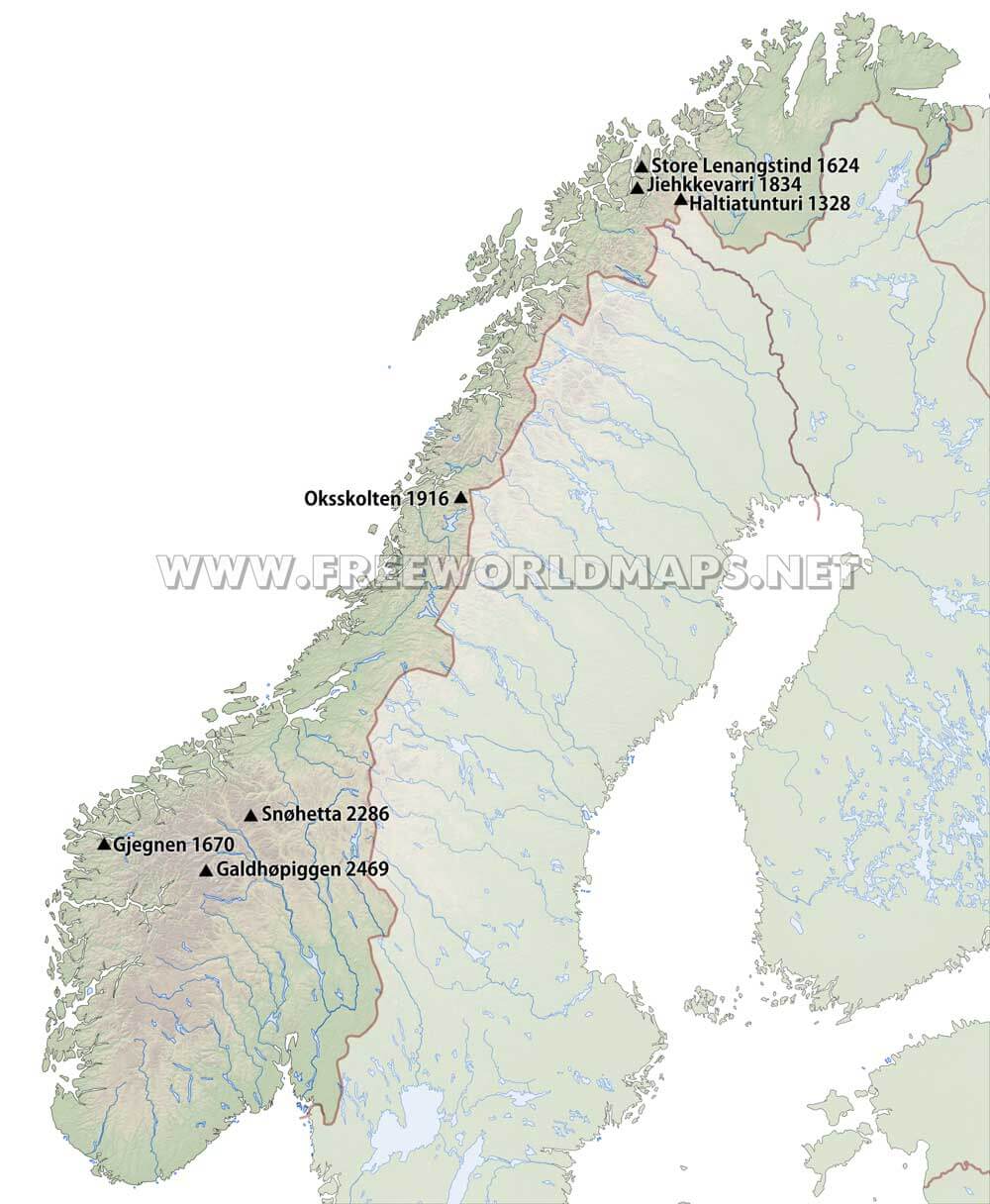The country is also one of the most mountainous in Europe, with the Scandinavian Mountains taking much if its terrain, and is the most dominant geographic feature of the country. The highest elevation is situated in the southern parts of these ranges, called Galdhøpiggen with a height of 2469 meters. Not far from this elevation can be found Europe's deepest lake, the Hornindalsvatnet, with an estimated depth of 514 meters. There are also a couple of other two-thousanders shown on the Norway map, the most prominent of those two-thousanders (excluding the Galdhøpiggen) is Snøhetta at 2286 meters elevation, with a topographic prominence of 1675 meters, thus being on of the ultra prominent peaks of the world. Jiehkkevárri, situated in the northern ranges of the Scandinavian Mountains, is lower in terms of elevation with 1834 meters, but its prominence is the second highest in the country, exactly 1741 meters. The fourth most prominent peak is the Store Lenangstind, completing the four ultra peaks of the country.
