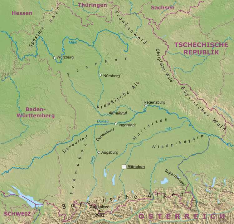 Regionen: Bayerische Alpen, Schwaben, Niederbayern, Hallertau, Franken, Frankenwald, Spessart, Bayerischer Wald, Rupertiwinkel, Fränkische Alb, Oberpfälzer Wald, Rhön