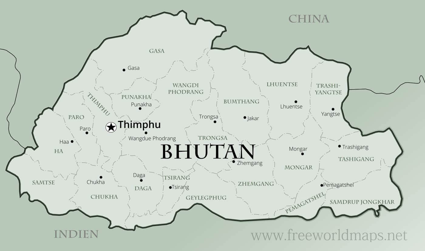 Größte Städte: Punakha, Tongsa, Tashigang, Paro, Ha, Phuntsholing, Sarbhang, Samdrup Jongkhar
