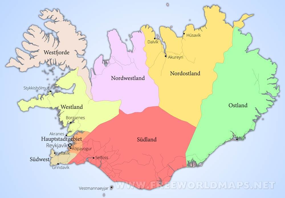 Größte Städte: Keflavík, Grindavík, Húsavík, Dalvík, Eskifjörður, Grundarfjörður, Vík, Bolungarvík