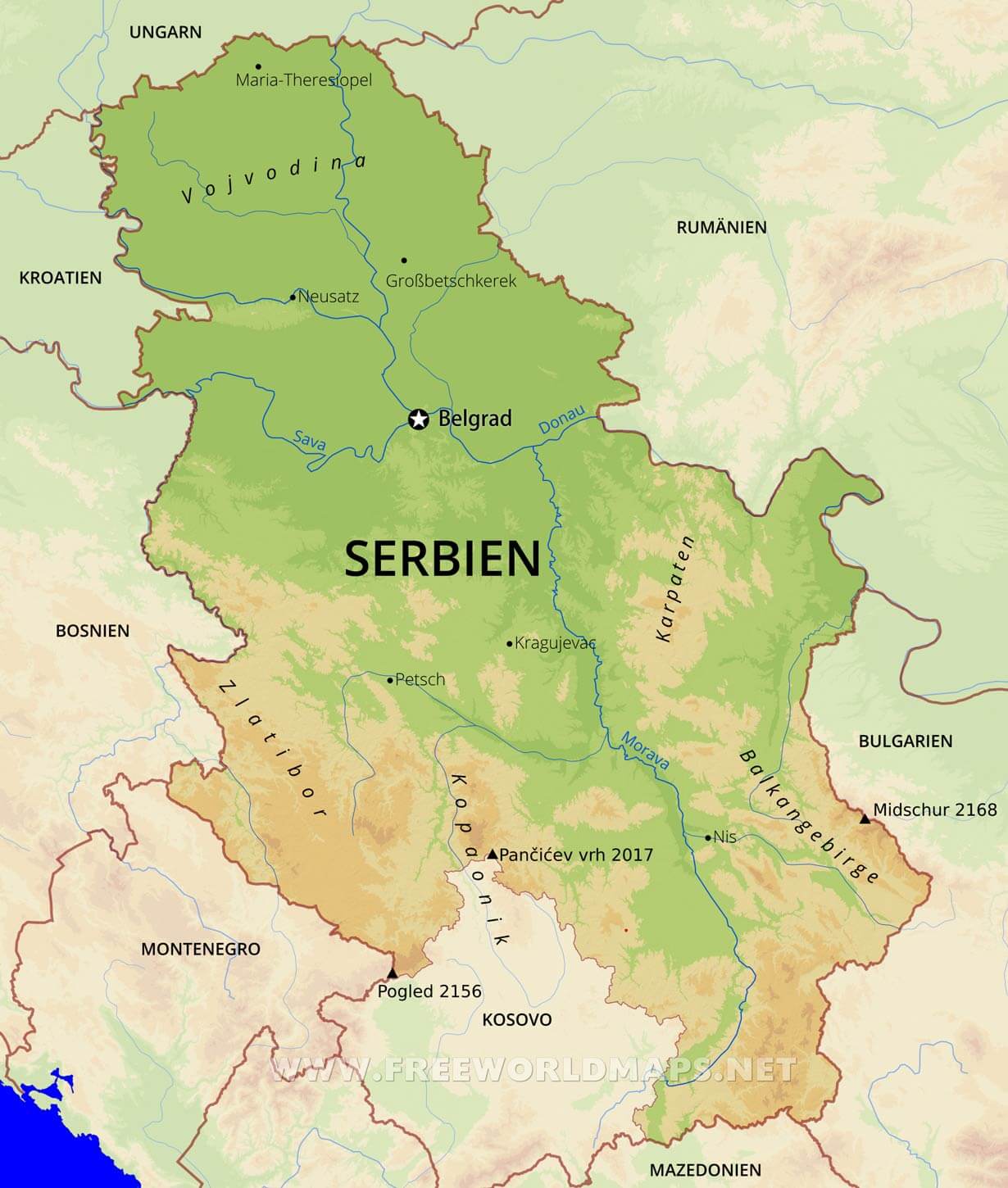 Flüsse: Donau, Theiß, Morava, Save, Drina