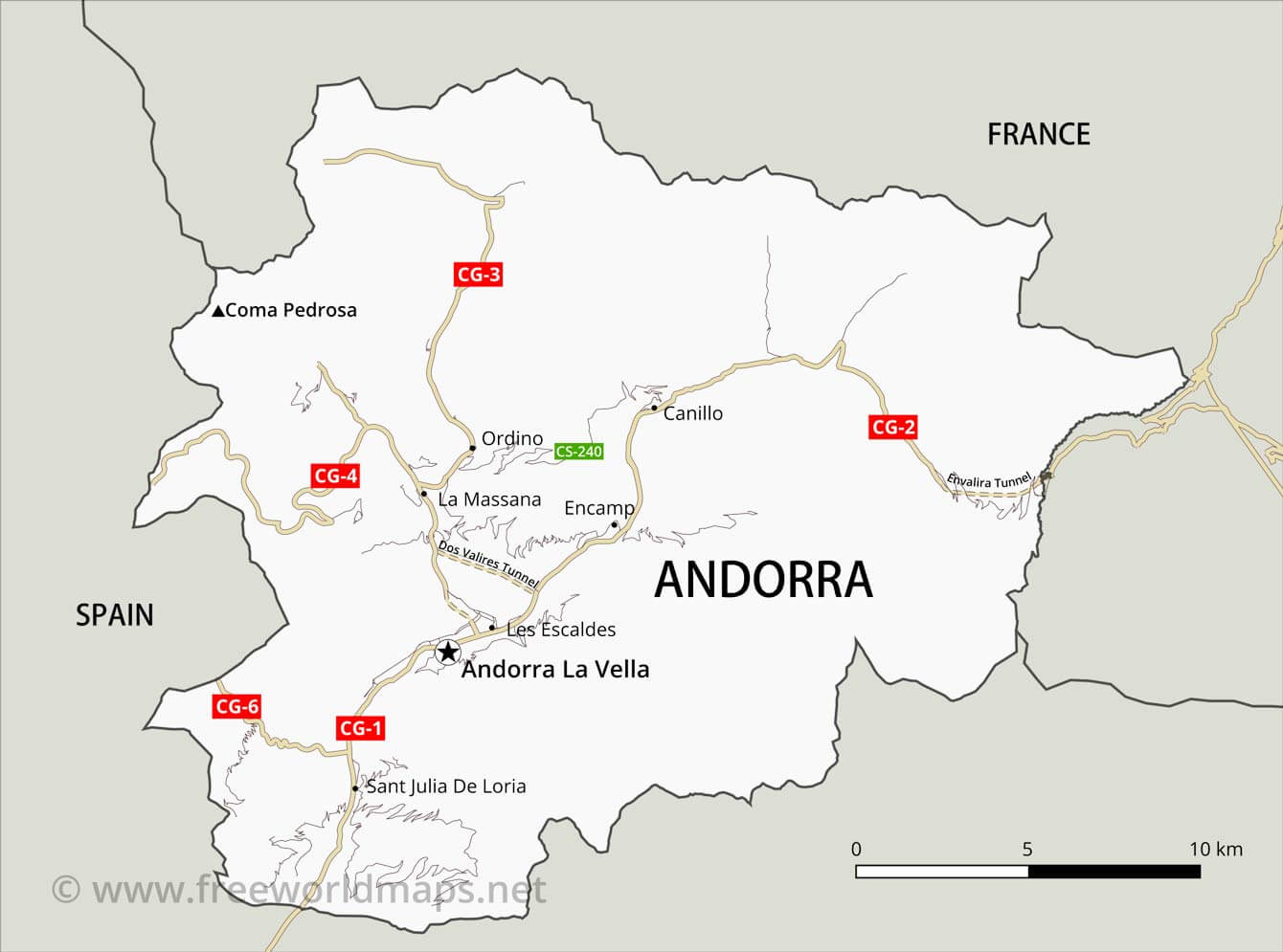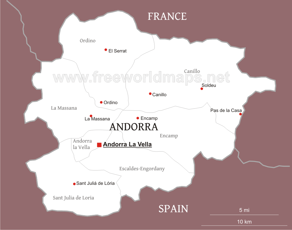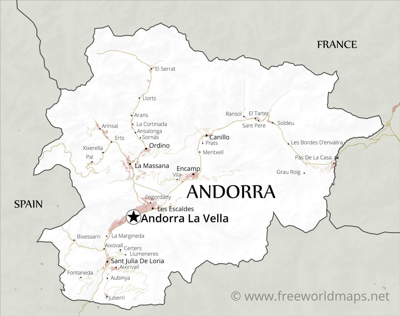 The capital is Andorra la Vella, other cities include El Serrat, Ordino, La Massana, Encamp, Canillo, Soldeau, Pas de la Casa, Sant Julia de Loria.