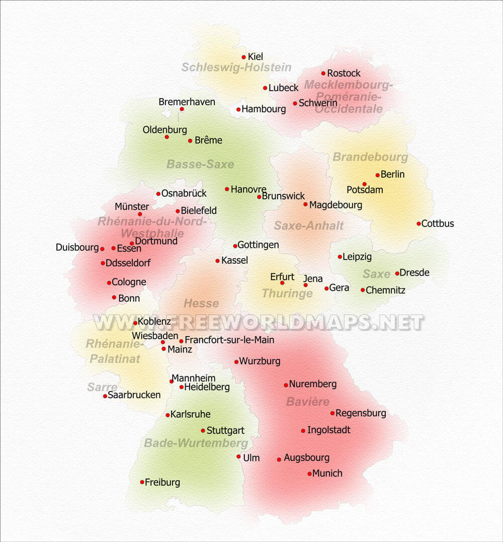 Eifel, Rhön, Massif schisteux rhénan, Monts Métallifères, Hartz, Fossé rhénan, Plaine d'Allemagne du Nord, Alpes bavaroises, Forêt-Noire, Forêt de Bavière, Jura souabe, Forêt de Teutberg, Forêt de Thuringe, Bassin de Thuringe, Plateau des lacs mecklembourgeoisÎles de l'Allemagne: