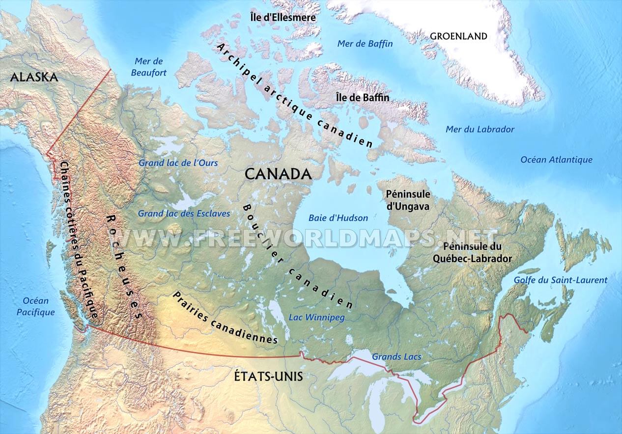 Le Canada occupe un très vaste territoire entre 3 différents océans : bordé du côté ouest par l'océan Pacifique, nous retrouvons l'océan Atlantique du côté est et l'océan Arctique au nord du pays. La devise « d'un océan à l'autre » de ce beau et grand pays prend tout son sens, devant ce relief majestueux.