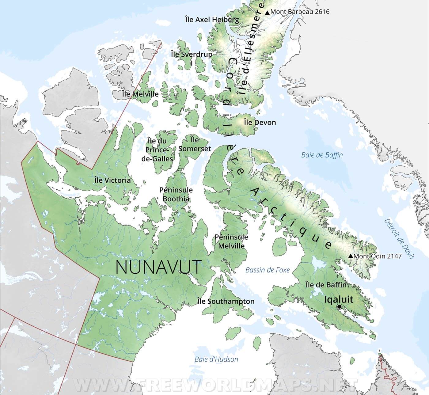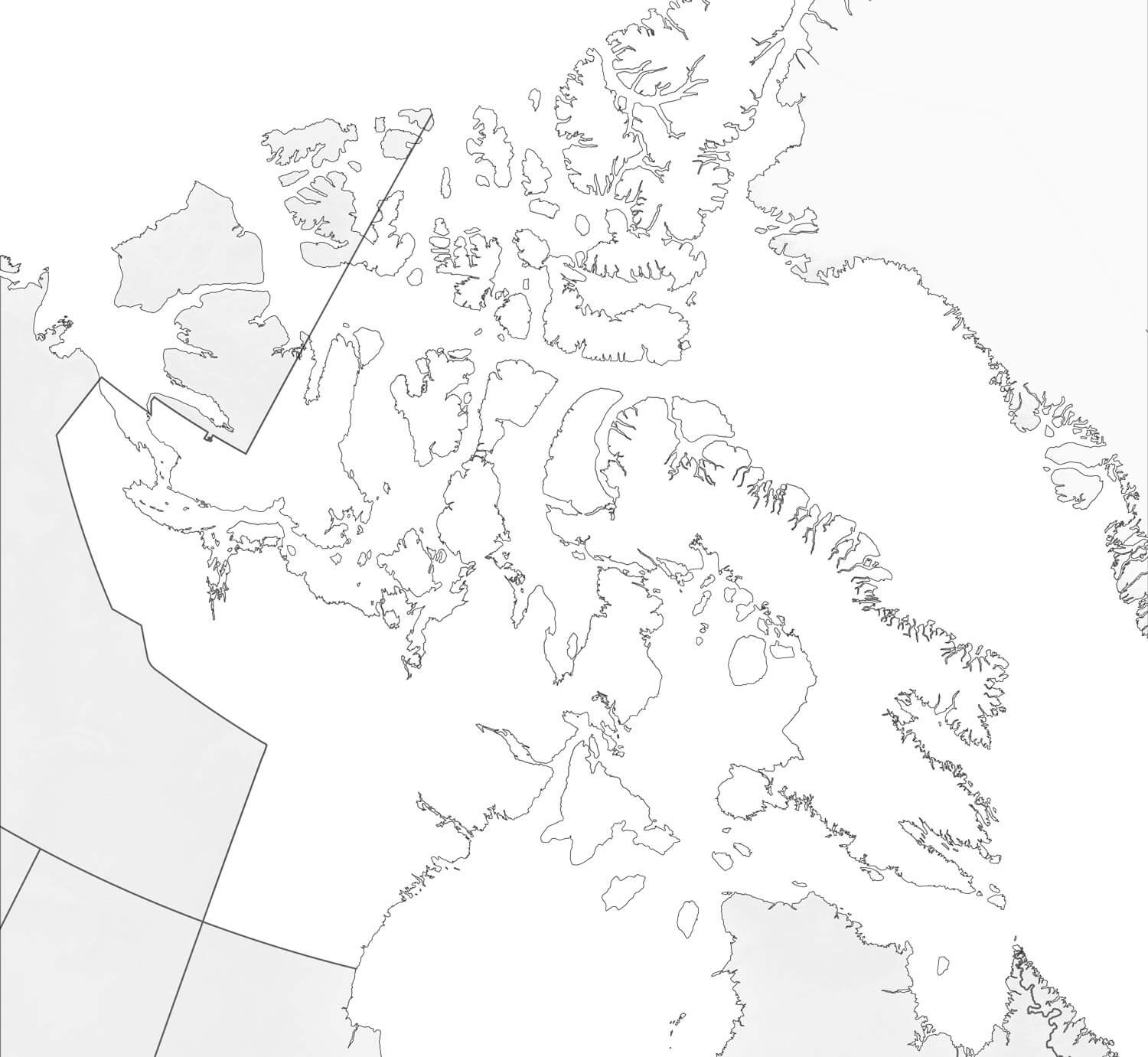 Île d'Ellesmere, Île Victoria, Île du Prince- de-Galles, Île Somerset, Péninsule Boothia, Péninsule Melville, Île Southampton, Île Devon, Île Melville, Île Sverdrup I, Île Axel Heiberg, Île de Baffin