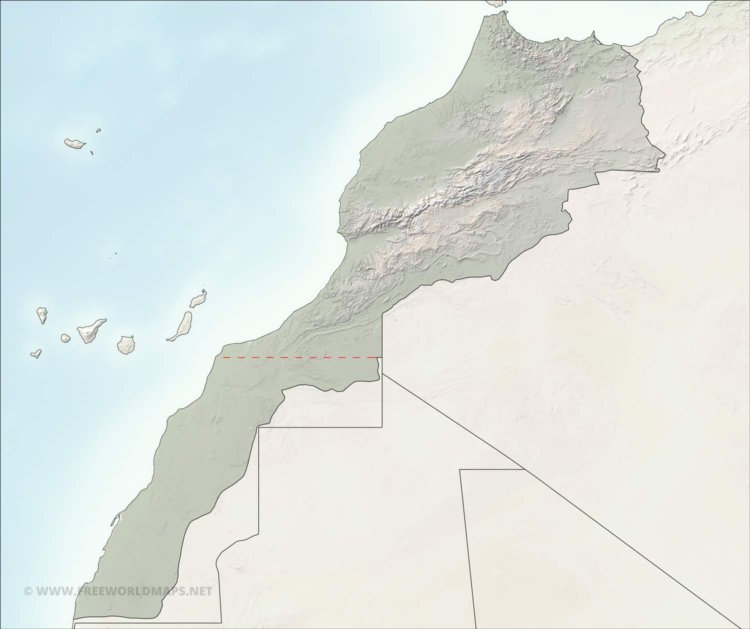 La surface du Maroc est de 710 850Km² dont 264 300Km² de Désert, les pays limitrophes sont l'Algérie à l'est, la Mauritanie au sud et l'Espagne au nord. Le territoire marocain est montagneux puisque plus de 25%, de sa surface est constituée de montagnes avec trois chaînes principales: